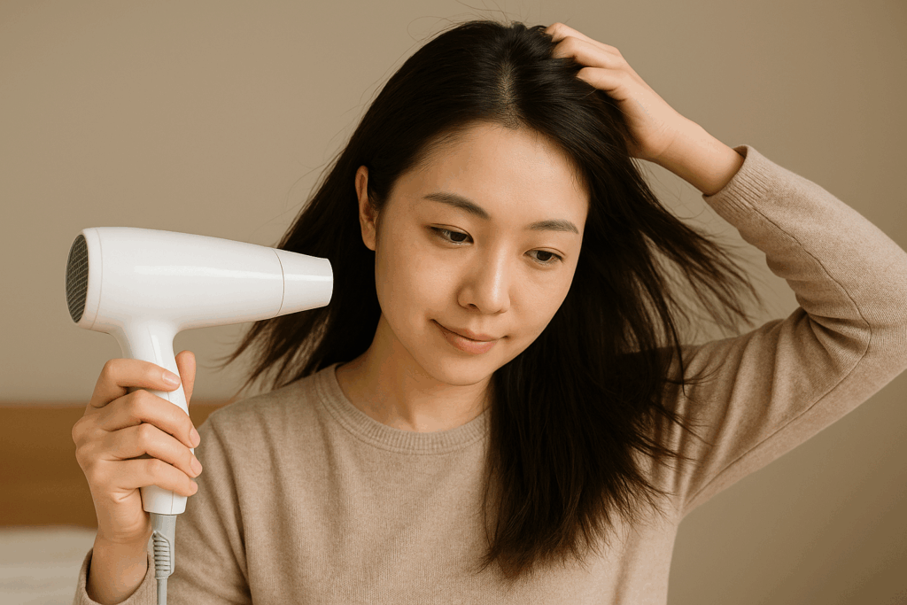 - ドライヤーは「分け目の逆方向」から風を当てて、根元をふんわり起こす