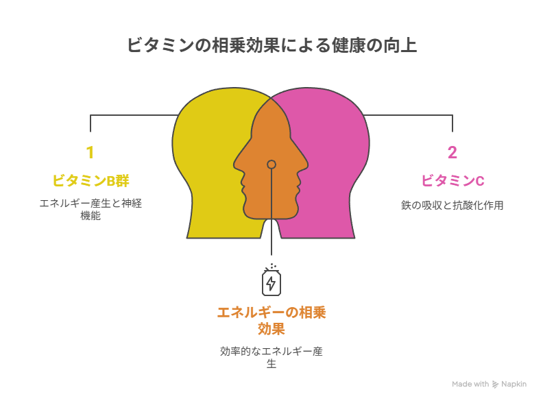 B群はたんぱく質代謝とエネルギー産生、Cはコラーゲン合成と鉄吸収、Eは末梢血流と抗酸化を担当。三者を同じ食事でそろえると相乗効果が生まれます。