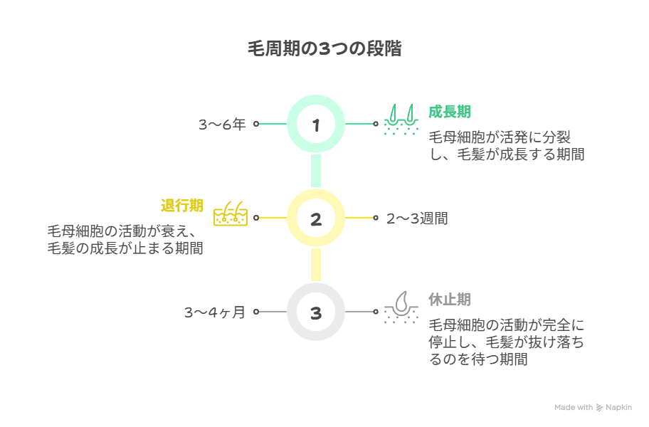 | 休止期脱毛(ストレス・発熱・ダイエット後) | あり | 2〜6か月で改善傾向、1年以内に落ち着くことが多い | 原因イベント(高熱・術後・極端な減量)から2〜3か月後に脱毛がピークになりやすい |